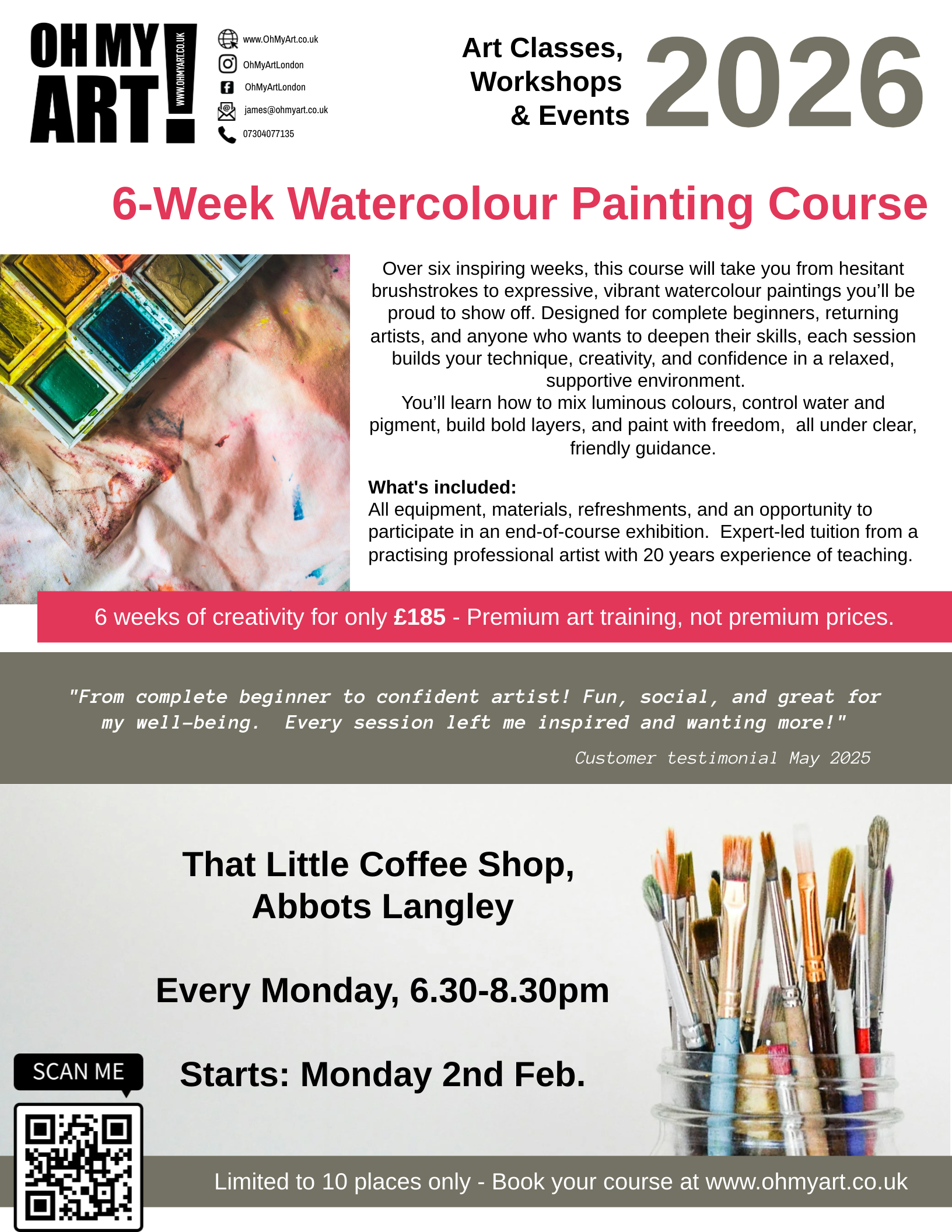 Over six inspiring weeks, this course will take you from hesitant brushstrokes to expressive, vibrant watercolour paintings you’ll be proud to show off. Designed for complete beginners, returning artists, and anyone who wants to deepen their skills, each session builds your technique, creativity, and confidence in a relaxed, supportive environment.